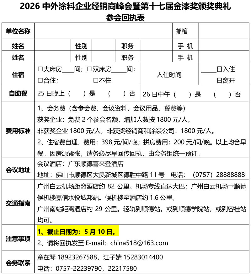 为弘扬中外涂料品牌,表彰杰出个人与企业,助力市场突破与品牌提升,推动产业链高效对接,树立行业标杆,中外涂料网决定于2026年5月25日—27日在广东顺德喜来登酒店隆重举行“2026中外涂料企业经销商峰会暨第十七届金漆奖颁奖典礼”。