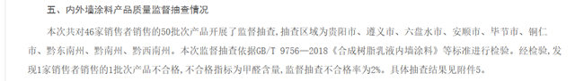本次共对46家销售者销售的50批次产品开展了监督抽查,抽查区域为贵阳市、遵义市、六盘水市、安顺市、毕节市、铜仁市、黔东南州、黔南州、黔西南州。本次监督抽查依据GB/T 9756—2018《合成树脂乳液内墙涂料》等标准进行检验。经检验,发现1家销售者销售的1批次产品不合格,不合格指标为甲醛含量,监督抽查不合格率为2%。
