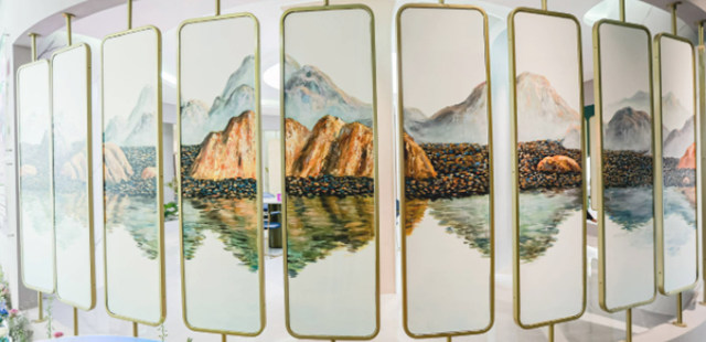 进入展厅门口,映入眼帘的美涂士紫形象墙,那优雅高贵的紫,美丽动人,色彩鲜丽贯彻始终,无时不在传递艺术让家更美的信息。400平的展厅里,家居生活模拟空间随处可见,高贵的紫色点缀期间。游走在艺术的长廊中,一组组的艺术山水画围绕着圆弧排列,仿佛穿梭在时空的隧道,美出了新高度。