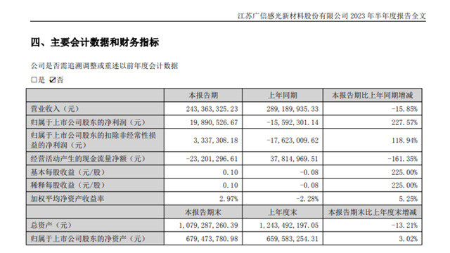 先说半年报,广信材料2023年上半年营业收入约2.43亿元,同比减少15.85%;归属于上市公司股东的净利润约1989万元;基本每股收益0.1元。