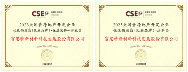 富思特凭借过硬的综合实力以及良好的业界口碑,入选2023央国资房地产开发企业优选供应商(民族品牌)涂料类、保温装饰一体板类两项大奖。获此荣誉,是业内对富思特二十余年来专注涂保领域的高度认可,富思特行业地位和品牌影响力再获权威认定。