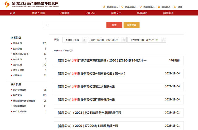 从2023年1月1日至11月8日,中外涂料网在全国企业破产重组案件信息网输入关键字涂料,共检索出250条记录,大约涉及约近百家涂料企业。