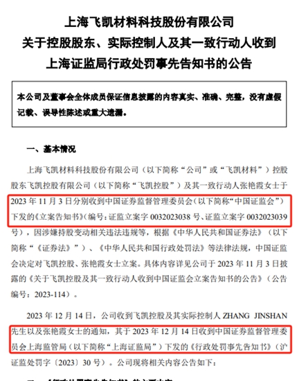 12月14日,飞凯发布了《关于控股股东、实际控制人及其一致行动人收到上海证监局行政处罚事先告知书的公告 》。