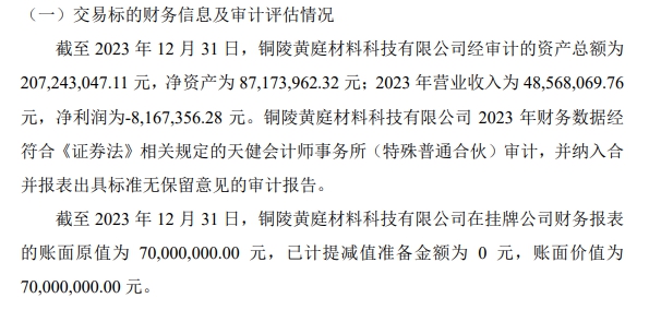 出售子公司股权的公告显示,铜陵黄庭2023年实现营业收入4856.81万元,净利润亏损816.74万元。截至2023年末,铜陵公司经审计的资产总额为2.07亿元,净资产为8717.4万元。