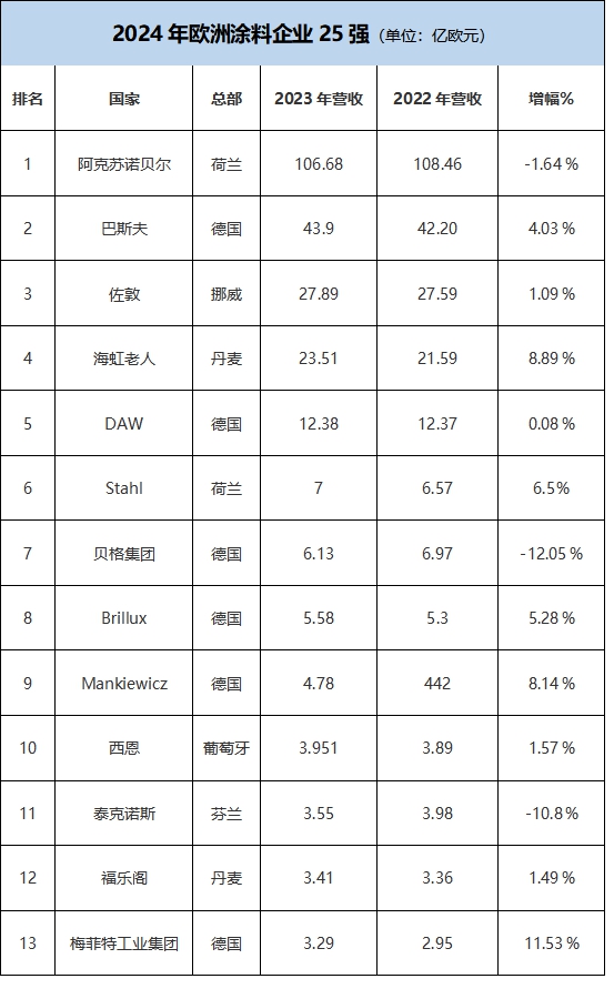 此次榜单的公布为欧洲涂料行业提供了重要的市场参考,同时也揭示了行业内不同公司的发展态势和竞争格局。
