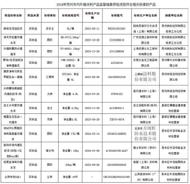 苏州市监局的执法人员还到了12家涂料实体店,抽检的12批次涂料产品全部合格。这12批次的涂料产品是阿克苏诺贝尔太古漆油(上海)有限公司生产的多乐士焕悦无添加白漆、广东巴德士新材料有限公司生产的淳天然抗菌内墙水漆、上海巴德士化工新材料有限公司的外墙防雾防水墙面漆、东莞大宝化工制品有限公司生产的零纯+无添加炫白净味墙面漆、三棵树涂料股份有限公司生产的三棵树康家净味竹炭抗甲醇五合一墙面漆、庞贝捷涂料(上海)有限公司生产的大师馨怡居超哑内墙乳胶漆(粉白)、芬琳雅露五合一内墙漆、亚士创能科技(滁州有限公司)生产的亚士大可爱内墙水漆、北京东方雨虹防水技术股份有限公司生产的KRAUTOL易施白净味高遮盖内墙漆、雅士利涂料(苏州)有限公司生产的雅士利装饰环保内墙乳胶漆(白色)(红色Mini版)、岩壁(上海)涂料有限公司的炫黑宝净味内墙水漆、立邦装饰材料(广州)有限公司生产的立邦专优5合1。(中外涂料网)