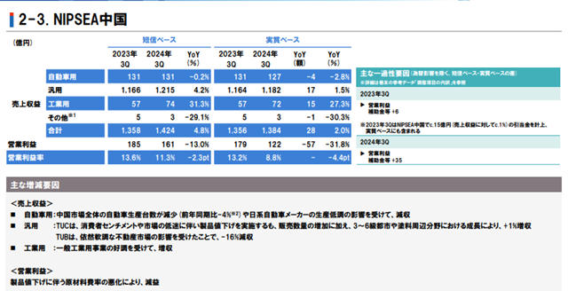 在Nipsea部门,汽车涂料的销售收益方面呈现出一定的波动性。泰国汽车产量的减少导致该地区的销售收益低于预期。然而,中国汽车产量的增加则有效弥补了这一不足,使得整个细分市场超过去年同期。