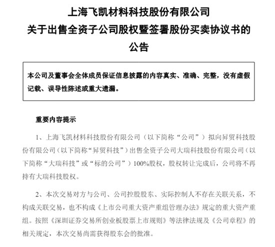 1月6日,光缆涂料龙头企业飞凯材料发布公告,董事会同意以2.275亿元,出售其在台湾的全资子公司大瑞科技100%股权,同时对在大陆的全资子公司和成显示增资 3.06 亿元。