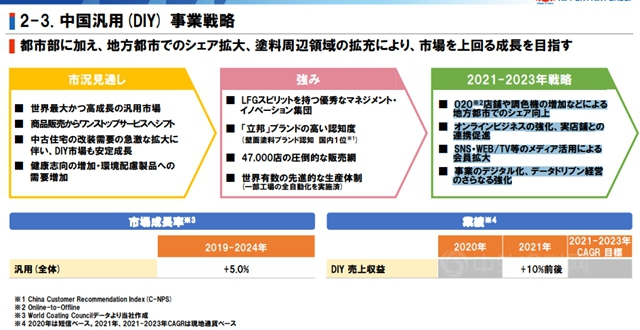 关于立邦中国家装零售涂料未来三年的战略,除城市外,通过扩大地方城市的市场占有率,扩充涂料周边领域,实现超越市场的增长。在2021年实现营业收入增长10%左右的目标。