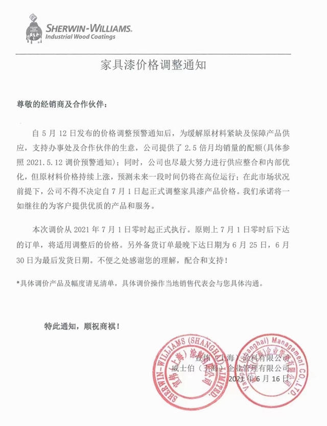 6月16日,宣伟威士伯发布家具漆价格调整通知称,自5月12日发布的价格调整预警通知后,为缓解原材料紧缺及保障产品供应,支持办事处及合作伙伴的生意,公司提供了25倍月均销量的配额(具体参照2021.5.12调价预警通知);同时,公司也尽最大努力进行供应整合和内部优化,但原材料价格持续上涨,预测未来一段时间仍将在高位运行:在此市场状况前提下,公司不得不决定自7月1日起正式调整家具漆产品价格。我们承诺将一如继往的为客户提供优质的产品和服务。本次调价从2021年7月1日零时起正式执行。原则上7月1日零时后下达的订单,将适用调整后的价格另外备货订单最晚下达日期为6月25日,6月30日为最后发货日期。