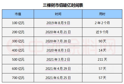 中外涂料注意到,三棵树市值首次突破百亿大关在2019年8月9日,第一个百亿用时2年2个月; 2020年三棵树实现三级连跳, 在2020年4月21日,总市值突破200亿元,第二个百亿用时近9个月; 2020年7月20日,总市值突破300亿元,第三个百亿用时90天; 2020年8月3日,三棵树总市值突破400亿元,第四个百亿用时14天; 2021年3月2日以最新收盘价进行计算,三棵树总市值达到502.3亿元,第五个百亿用时211天。2021年4月29日,三棵树市值突破600亿元,第六个百亿用时57天。2021年6月25日,三棵树市值突破700亿大关,用时57天。