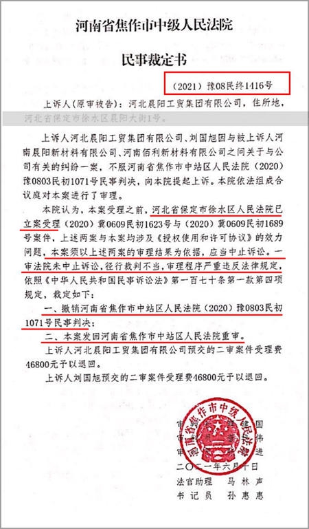 然而,不服判决的晨阳集团又上诉成功。6月21日,河北晨阳公众号发布《关于河北晨阳工贸集团与河南晨阳知识产权纠纷诉讼进展的公告》称,河南省焦作市中级人民法院依法就上诉人河北晨阳与被上诉人河南晨阳、河南佰利新材料有限公司之间纠纷一案作出(2021)豫08民终1416号《民事裁定书》,以一审法院未中止诉讼,径行裁判不当,审理程序严重违反法律规定为由,裁定撤销河南省焦作市中站区人民法院(2020)豫0803民初1071号民事判决,并发回重审。