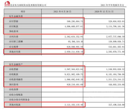 此外,东方雨虹还受累于回款问题。截至2020年底,东方雨虹应收预付款项为97.39亿元;应付预收款项为62.27亿元。到了今年6月30日应收预付款项增至154.17亿元,应付预收款项为66.26亿元。(注:应收预付款项包含应收票据、应收款项融资、应收账款、预付款项及其他应收款;应付预收款项包含应付票据、应付账款 、预收账款及其他应付款)。