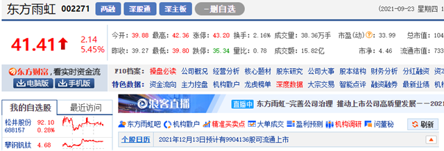 近期数据显示,东方雨虹股价继9月16日大跌8.58%、9月17日持续下跌1.16%,中秋节后股价也并未有所上涨。9月22日,东方雨虹股价继续下跌3.91%,股价报收39.27元,总市值为991亿元。截至到今日,股价出现回升,上涨了5.45%,报价41.41元,目前总市值重回千亿,达1045亿元。