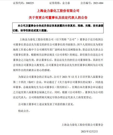 金力泰称,董事会于近日收到公司董事长景总法先生提交的辞任公司董事长的书面报告,因个人原因以及为更好地将工作重心集中于公司乘用车原厂涂料业务以及树脂业务,景总法先生辞去公司董事长职务。根据相关法律法规及《公司章程》的规定,辞任报告自送达公司董事会之日起生效。辞去董事长后,景总法先生仍担任公司董事职务,其辞任不会导致公司董事会人数变化。公司董事会对景总法先生担任董事长期间为公司发展所作出的贡献表示衷心的感谢。