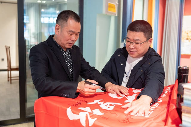 沈国共在中外涂料网“征涂万里行”旗帜上签名