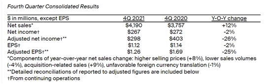 根据财报显示,2021年第四季度PPG实现净销售额约42亿美元(约合人民币266亿元),比去年同期增长约 12%;调整后净利润为2.98亿美元(约合人民币19亿元),同比下滑26%;每股摊薄收益 (EPS) 为 1.12 美元,调整后每股收益为 1.26 美元。PPG表示,2021年第四季度原材料成本通胀同比上涨30%,持续的供应中断和增加的制造中断对销售和运营成本产生负面影响。