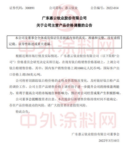 3月10日,惠云钛业公告,从即日起,在现有钛白粉销售价格基础上,上调公司钛白粉销售价格。其中国内客户销售价格上调1000元/吨,国际客户出口价格上调150美元/吨。