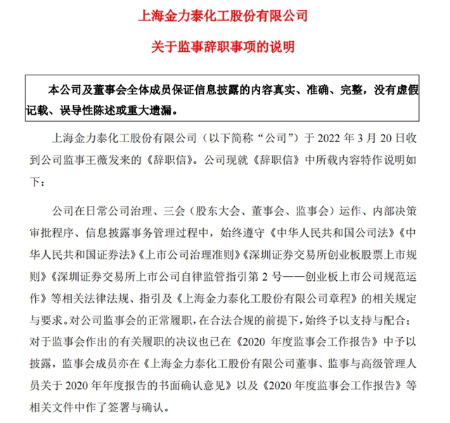 在关于监事辞职的公告中,金力泰称,于2022年3月20日收到监事王薇的《辞职信》: