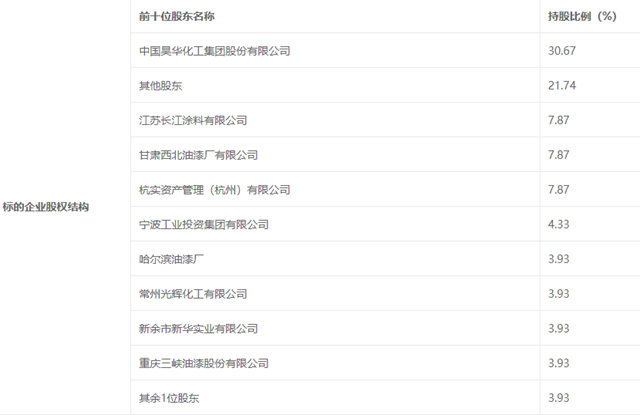 中外涂料网了解到,目前,华凌涂料有限公司由中国昊华化工集团股份有限公司(国有控股企业)持股30.67%,其他股东持股21.74%,甘肃西北油漆厂有限公司、江苏长江涂料有限公司、杭实资产管理(杭州)有限公司各持股7.87%,宁波工业投资集团有限公司持股4.33%,哈尔滨油漆厂、常州光辉化工有限公司、新余市新华实业有限公司、重庆三峡油漆股份有限公司、其余一位股东各持股3.93%。