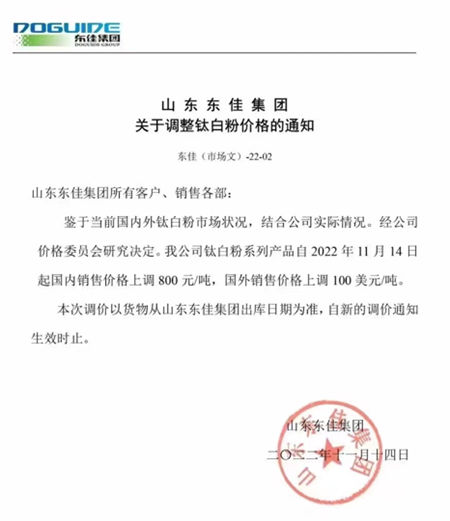 11月11日,钛白龙头龙佰集团借着双十一的热度高调宣涨。从2022年11月11日起,龙佰集团各型号钛白粉销售价格在原价格基础上调整价格,国内客户,每吨上调800元,国际客户每吨上调100美元。