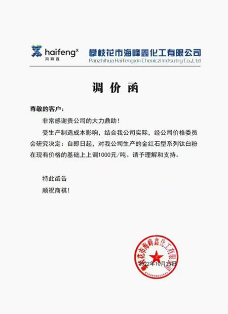 深圳美礼联钛业在涨价函中说,自10月26日起,美礼联各型号钛白粉产品及钛白粉相关原材料成品会在原销售价格基础上,销售价格上调1000元/吨。
