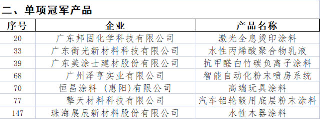 获得2022省级制造业单项冠军产品的广东涂企有5家:广东美涂士建材股份有限公司(冠军产品为抗甲醛白竹碳负离子涂料)、珠海展辰新材料股份有限公司(冠军产品为水性木器涂料)、紫荆花集团恒昌涂料 (惠阳)有限公司(冠军产品为高端玩具涂料)、擎天材料科技有限公司(冠军产品为汽车铝轮毂用底层粉末涂料)、广东邦固化学科技有限公司(冠军产品为激光全息烫印涂料)。