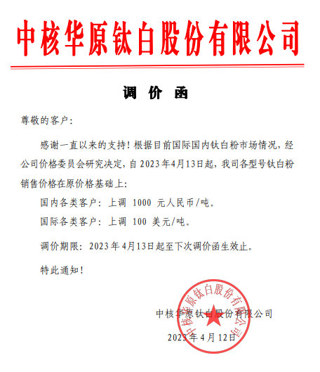 4月11日晚间,国内第一大钛白粉龙头龙佰集团公告,自即日起,公司各型号钛白粉(包括硫酸法钛白粉、氯化法钛白粉)销售价格在原价基础上对国内各类客户上调700元/吨,对国际各类客户上调100美元/吨。