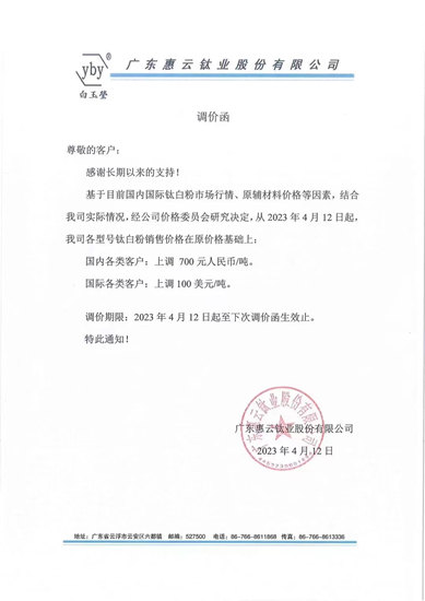 4月13日晚间,继龙佰集团、惠云钛业、中核钛白等钛白粉头部企业宣布上调各型号钛白粉销售价格后,金浦钛业也坐不住了,发布公告称,自2023年4月14日起,公司锐钛型和金红石型钛白粉销售价格在原价基础上,对国内各类客户上调700元人民币/吨,对国际各类客户上调100美元/吨。