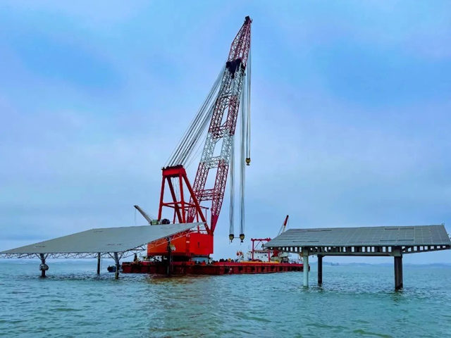 该项目是在近海开放式海域条件下建成的国内首个、全球最大的桩基固定式海上光伏,位于山东省烟台市海阳海域,离岸6.5千米,平均水深7米,建设了308千瓦大模块和92.4千瓦小模块两种实证方案,将为在该海域规划建设的HG34桩基固定式海上光伏(简称“HG34海上光伏项目”)验证技术路线,并提供主要设备适用性和工程经济性等关键数据。HG34实证项目离网发电将为我国在海上光伏领域迈上规模化、商业化之路奠定坚实的基础。