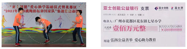 在2020年11月9日,亚士与广州花都区人民政府举行的广州综合智能制造基地项目投资签约仪式上,七星小学这所被跳绳改变命运的特色学校,给李金钟董事长和王永军副总裁留下了深刻印象。2021年4月8日,亚士向七星小学捐赠100万元,帮助七星小学改善办学条件,支持孩子们参加2021年世界跳绳锦标赛。时隔两年多,亚士再次走进七星小学,为全校师生送上节日祝福,并为上百位学生送去牛奶、书包、文具等慰问品以及助学金。
