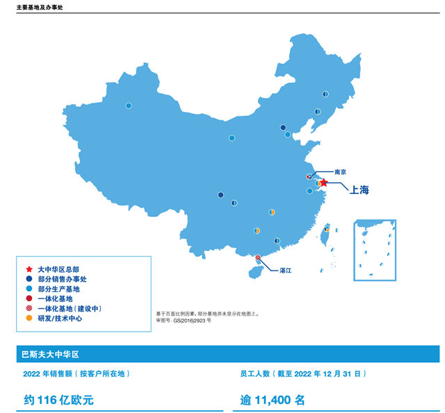 目前,巴斯夫在华主要有六大生产基地,分别是:上海浦东科技创新园、上海漕泾基地、南京基地、南京一体化基地、重庆基地、湛江一体化基地。