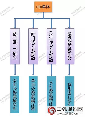 HDI的挥发性较大,毒性也大,一般是将其与水反应制成缩二脲二异氰酸酯,或者催化形成三聚体,用于制造非黄变聚氨酯涂料、胶粘剂、弹性体等。