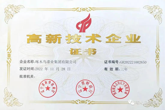 根据国家《高新技术企业认定管理办法》和《高新技术企业认定管理工作指引》的相关规定,啄木鸟漆业集团凭借专业的研发队伍、雄厚的技术实力、持续的创新能力、科学的企业管理,啄木鸟漆业集团有限公司又一次顺利通过复审继续荣获“高新技术企业”称号。