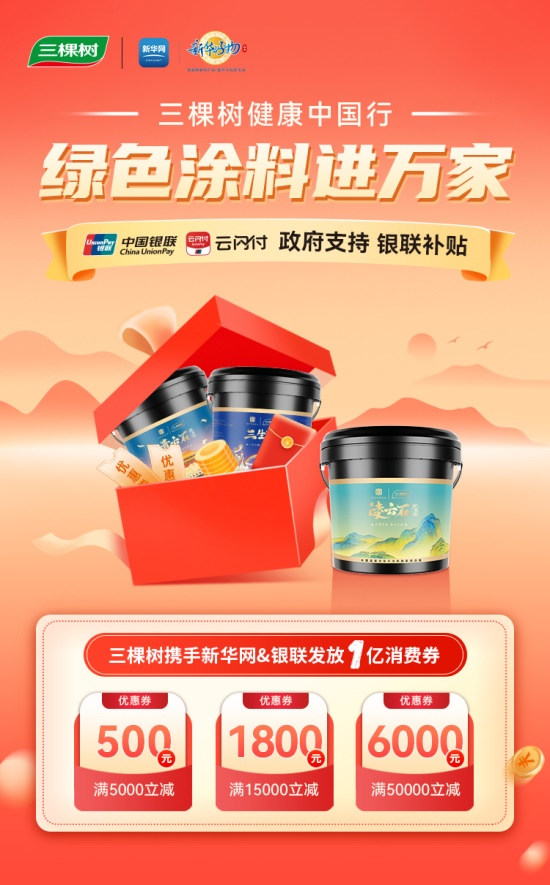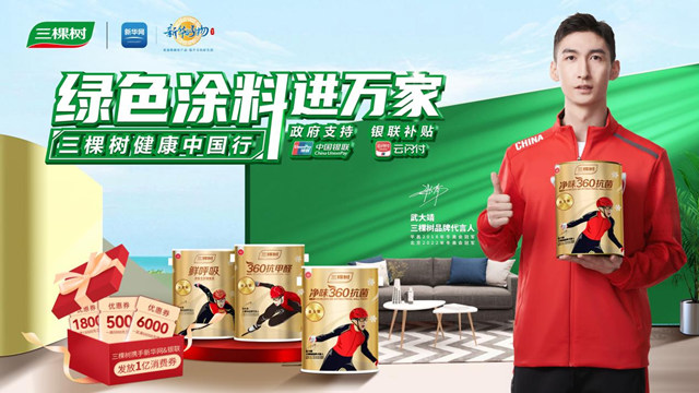 近日,三棵树携手新华网及中国银联共同启动《三棵树绿色涂料进万家》活动,以巨大的优惠政策助力国人打造健康中国家,积极推动健康战略的迭代创新与绿色家居行业转型升级。