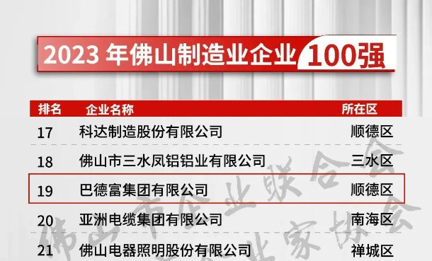▲巴德富位列2023年佛山制造业100强榜第19名