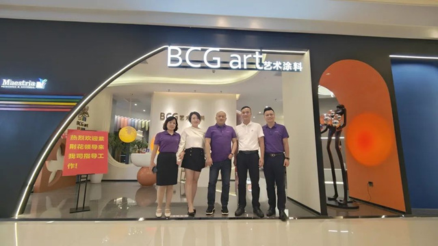 会议后,解总带领全体管理团队来到海口紫荆花BCG art艺术涂料色彩体验中心进行交流和学习,认真听取了经销商目前的经营情况和对公司的意见和建议,并给予了积极的反馈。