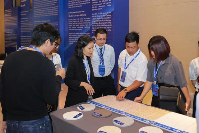 研讨会上,巴德富以越南市场需求为导向,围绕建涂乳液和防水乳液两大产品线,针对性推出了具有突出竞争力的产品。建涂乳液方面,重点介绍了净味除醛、零添加耐污、高光高硬度的内墙产品,以及耐雨痕、耐沾污外墙涂料解决方案;同时创新性提出能极大提高生产和施工效率的低碳轻彩石解决方案,备受现场客户的青睐。防水乳液方面,则重点介绍了丙烯酸改性聚合物水泥基材料和丙烯酸类的单组份防水材料解决方案,其健康环保、稳定优质的产品与解决方案引发全场注目。
