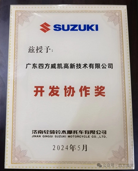 5月9日,以“奋进三十载 同心创未来”为主题的轻骑铃木2024年供应商大会在泉城济南隆重召开。四方威凯作为表现优异的供应商代表,获轻骑铃木颁发“开发协作奖”,以表彰在轻骑铃木摩托车涂料技术创新和协作开发中的卓越贡献。