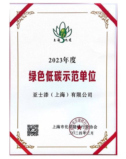 3月28日,上海市化学建材行业协会在第八届第四次理事会上开展了“2023年度绿色低碳示范单位”遴选工作,并公布入选名单,亚士成功被授予“2023年度绿色低碳示范单位”称号。