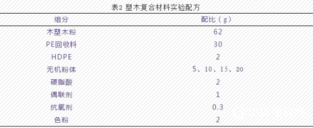 高密度聚乙烯(HDPE,5000S):中国石化兰州有限公司;木塑木粉(80目):山东临沂瑞达木粉有限公司;聚乙烯(PE)回收料:揭阳市蓝城区磐东林旭塑料厂;碳酸钙(CC-800、CC-1250):江西广源化工有限责任公司;滑石粉(HS-218、HS-358):江西广源化工有限责任公司;硅灰石,(GY-219、GY-319):江西广源化工有限责任公司;硬脂酸(SA1801):南昌明瑞化工有限公司;抗氧剂(GY-1010):北京极易化工有限公司;大红色粉(TC-SF01):东莞市泰昌树脂材料有限公司;硅烷偶联剂(KH550):南京和润偶联剂有限公司。
