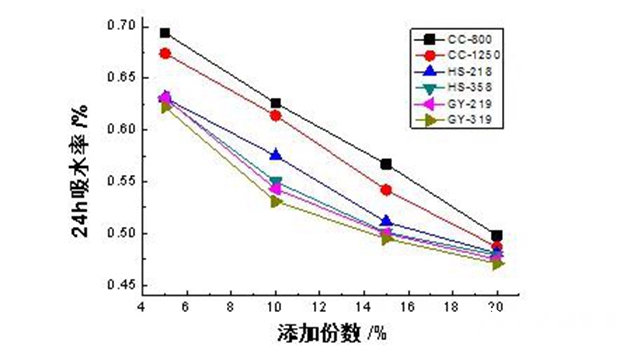 图6为PE塑木复合材料中添加不同品种无机粉体:CC-800、CC-1250,HS-218、HS-358、GY-219、GY-319的24h吸水率对比曲线。从图6中可以看出,随着无机粉体添加量的逐渐增加,PE塑木复合材料的24h吸水率逐渐降低,这是由于木粉的吸水率大于无机粉体,随着无机粉体填充量的增加,木粉相对含量减少,吸水率也随着降低[10,11];其中在不同无机粉体的添加份数下,硅灰石GY-319、GY219填充在PE塑木复合材料的吸水率最低,最有利于提高PE塑木复合材料的耐水性能,其次是滑石粉,再次是碳酸钙。