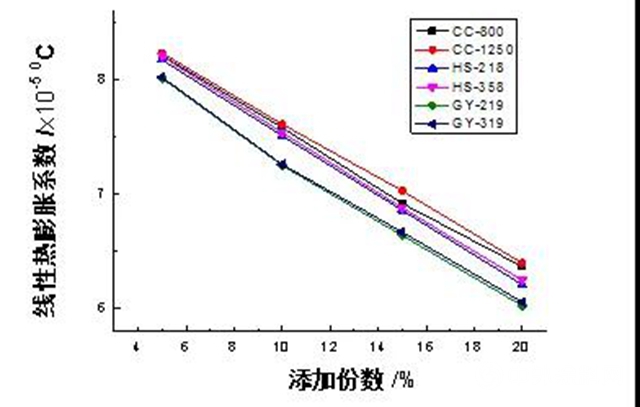 图8为PE塑木复合材料中添加不同品种无机粉体:CC-800、CC-1250,HS-218、HS-358、GY-219、GY-319的线性热膨胀系数对比曲线。从图8中可以看出,随着无机粉体添加量的逐渐增大,PE塑木复合材料的线性热膨胀系数逐渐减少;在不同无机粉体的添加份数下,硅灰石GY-219、GY-319 0填充在PE塑木复合材料的线性热膨胀系数最小,其次是滑石粉HS-218、HS-358,碳酸钙CC-800、CC-1250线性热膨胀系数最大,这是由于随着无机粉体填充量的增加,木粉相对含量减少,木粉线性热膨胀系数比无机粉体大,所以表现出线性热膨胀系数呈降低趋势[12]。此外还可以发现,在同种无机粉体填充的情况下,无机粉体的粒径越细填充在PE塑木复合材料的线性热膨胀系数越大。