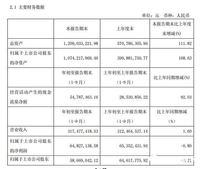 10月30日,湖南松井新材料股份有限公司(以下简称“松井股份”或“公司”)发布2020 年三季度报告。报告显示,公司前三季度实现营业收入3.17亿元,同比增长1.60%;归属于上市公司股东的净利润为6482.71万元,同比下降0.80%;每股收益为0.9800元。