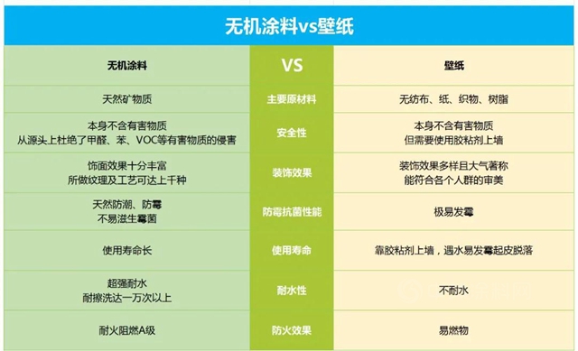 PK结果:无机涂料的装饰效果与壁纸旗鼓相当。虽然壁纸美观大方,但壁纸褪色、易燃、不耐潮等局限性也成为,无机涂料抗菌抑菌、耐火阻燃、颜色持久,不仅兼顾美观,还能兼顾健康与安全。