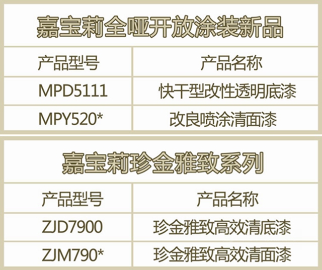 在高端实木全哑开放涂装上,嘉宝莉家具漆不仅有历经多年市场检验,收获市场无数好评的珍金雅致系列产品,更有在对市场进行深度调研后,成功开发的更为经济的全新产品。