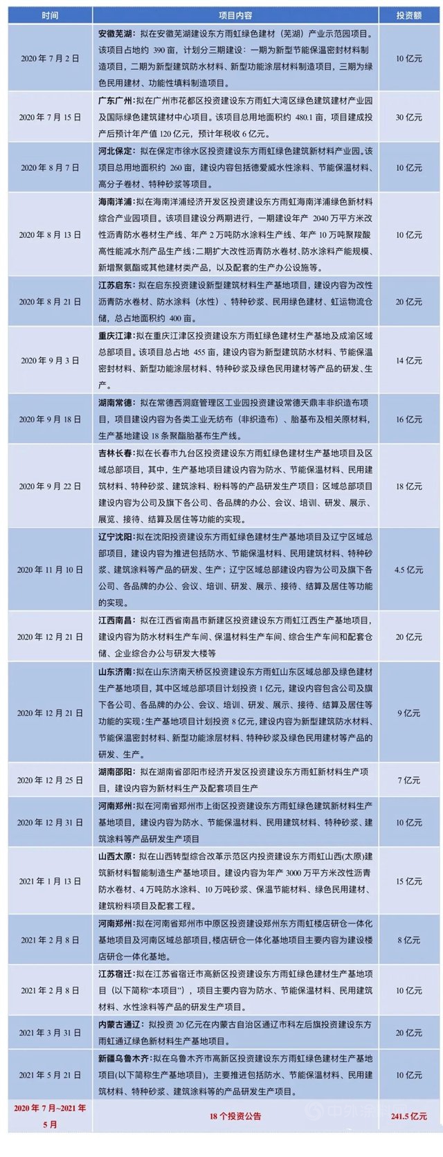 这是东方雨虹自去年7月以来,连续发布的第18个投资公告,累计投资金额达241.5亿元。