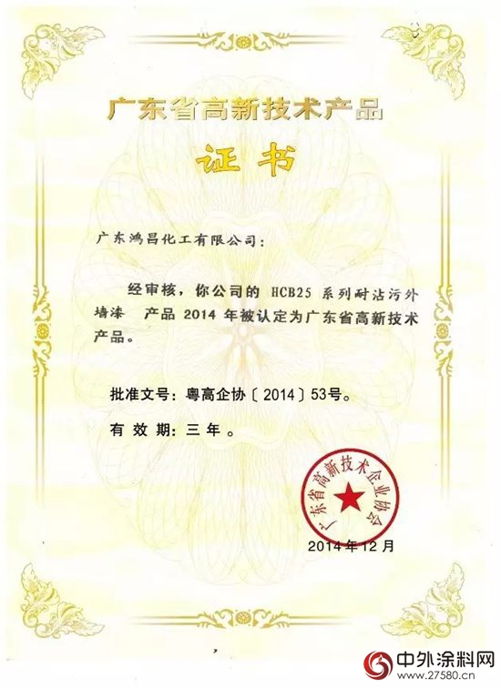 根据《关于组织申报广东省2014年高新技术产品认定的通知》(粤高企协[2014]32号)的要求,经企业申报、专家评审、公示、申诉处理等程序,近日广东省2014年高新技术产品名单正式公布。鸿昌化工自主研发的“防霉净味健康漆”、“纳米杀菌健康漆”、“海藻泥健康漆”、“耐沾污外墙漆”共计4款系列产品获得了政府专家的认可,被认定为广东省高新技术产品。