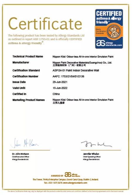 升级后的立邦儿童漆获颁“哮喘和过敏友好®️”产品认证