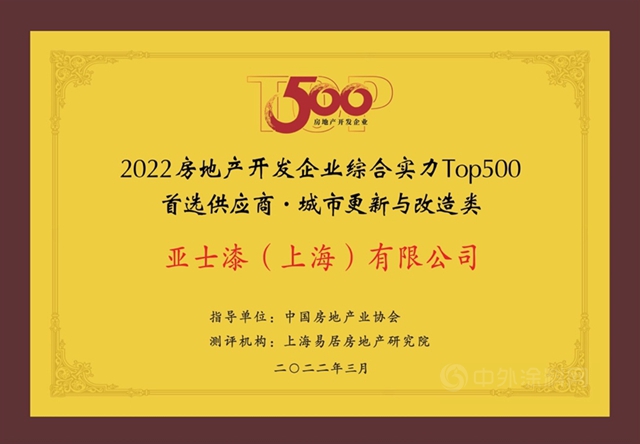 凭借领先的综合实力,亚士连续11年荣获“中国房地产开发企业500强首选供应商”,此次发布会上接连斩获6项殊荣,并蝉联中国房地产TOP 500首选供应商·保温材料类&涂料装饰保温一体板(材料)类品牌首选率TOP1!